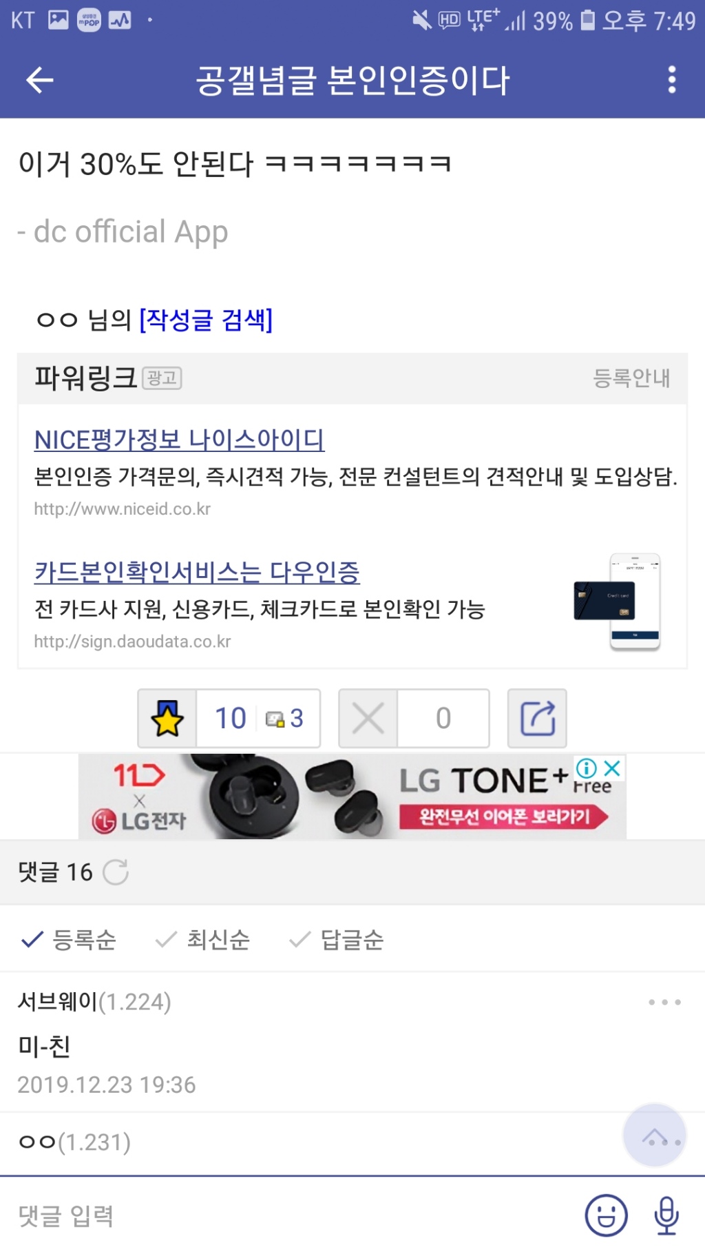 디시 인사이드 공익갤러리, ㅇㅇ, “야념글에 공익근무요원때문에 화나요 이거 공익본인이다”, (2019.12.23)