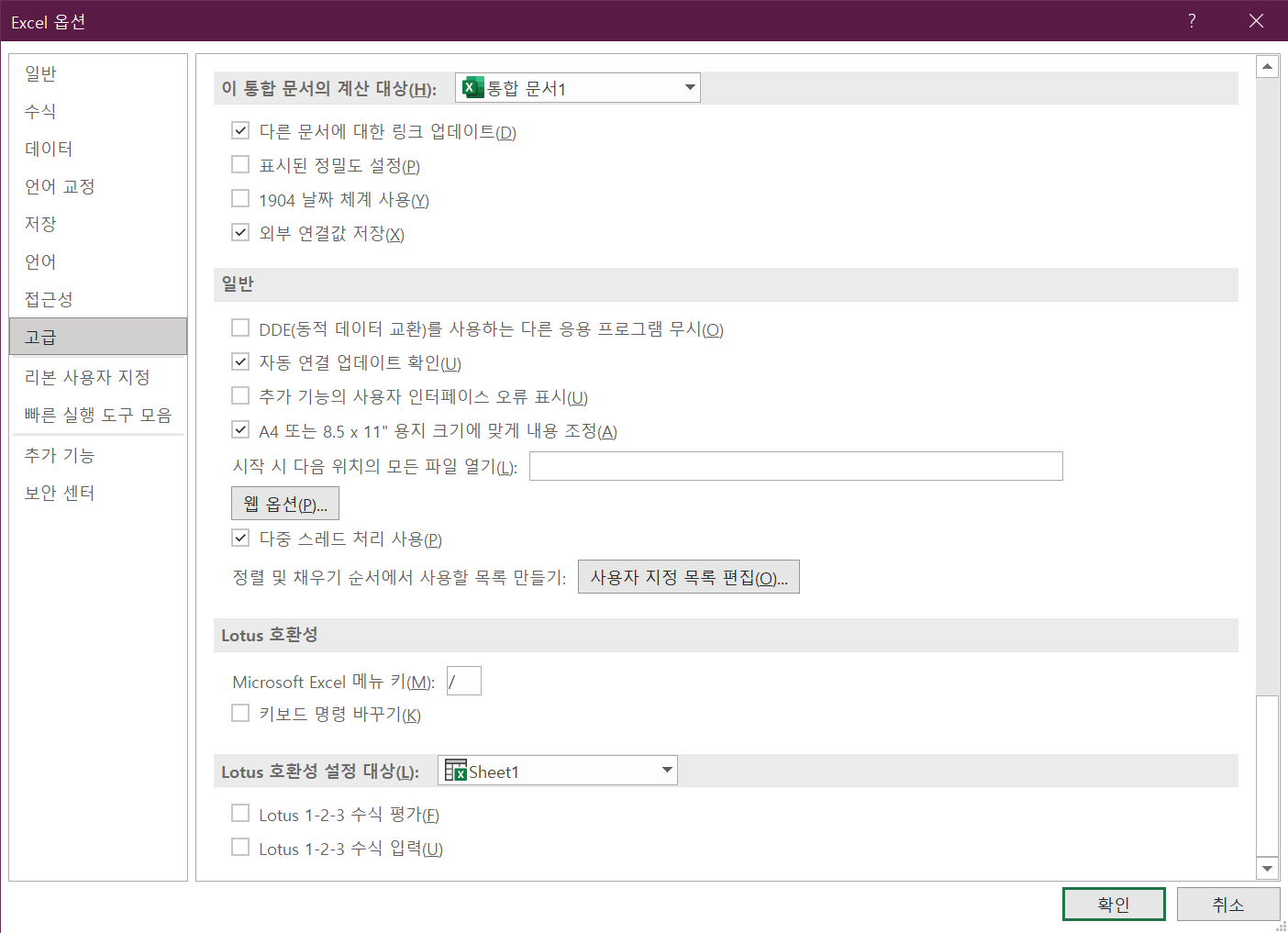2. [옵션] --> [고급] -->(범주)[사용자 지정 편집] 수정